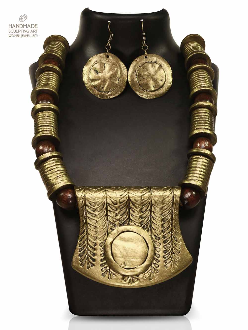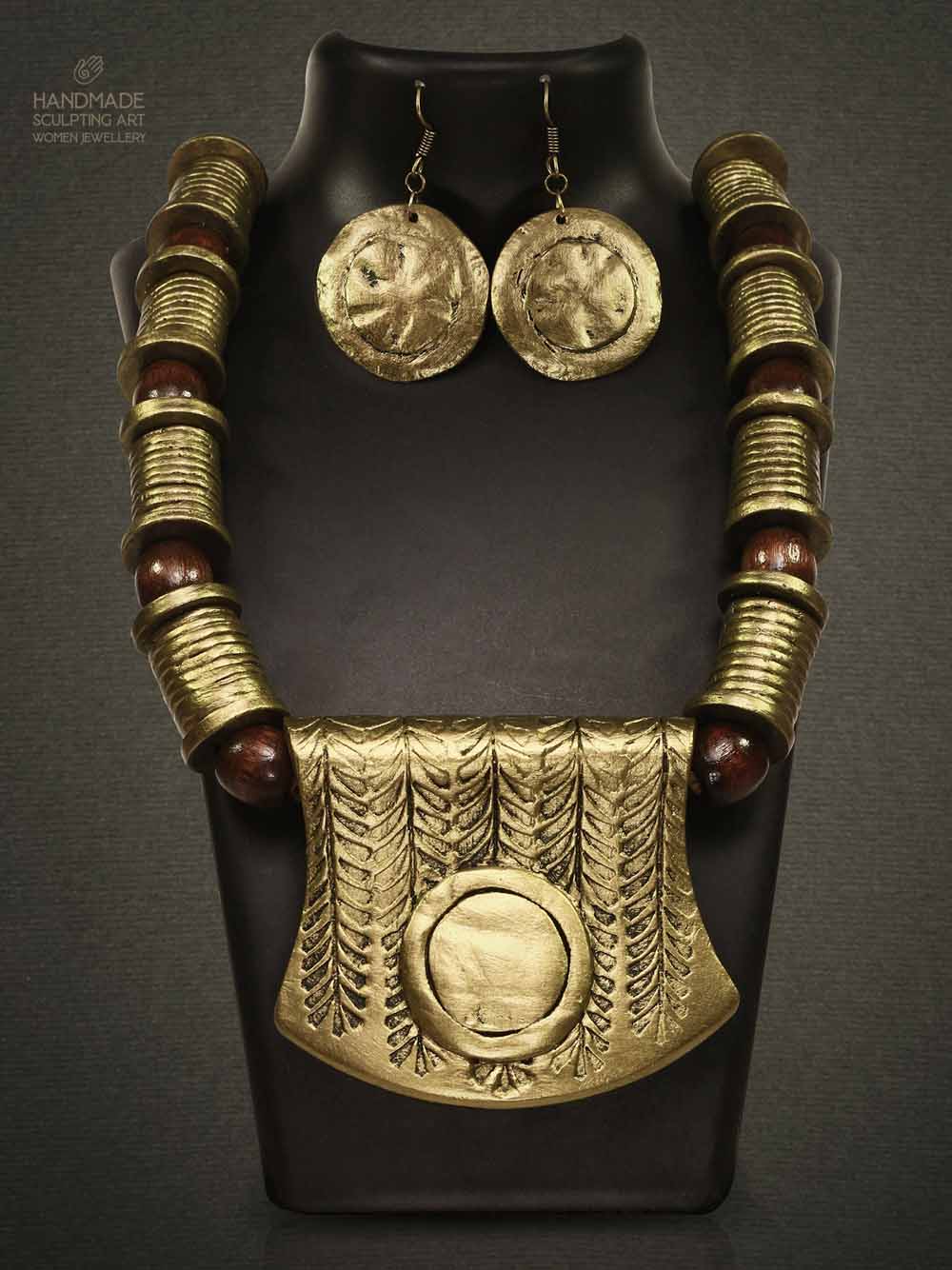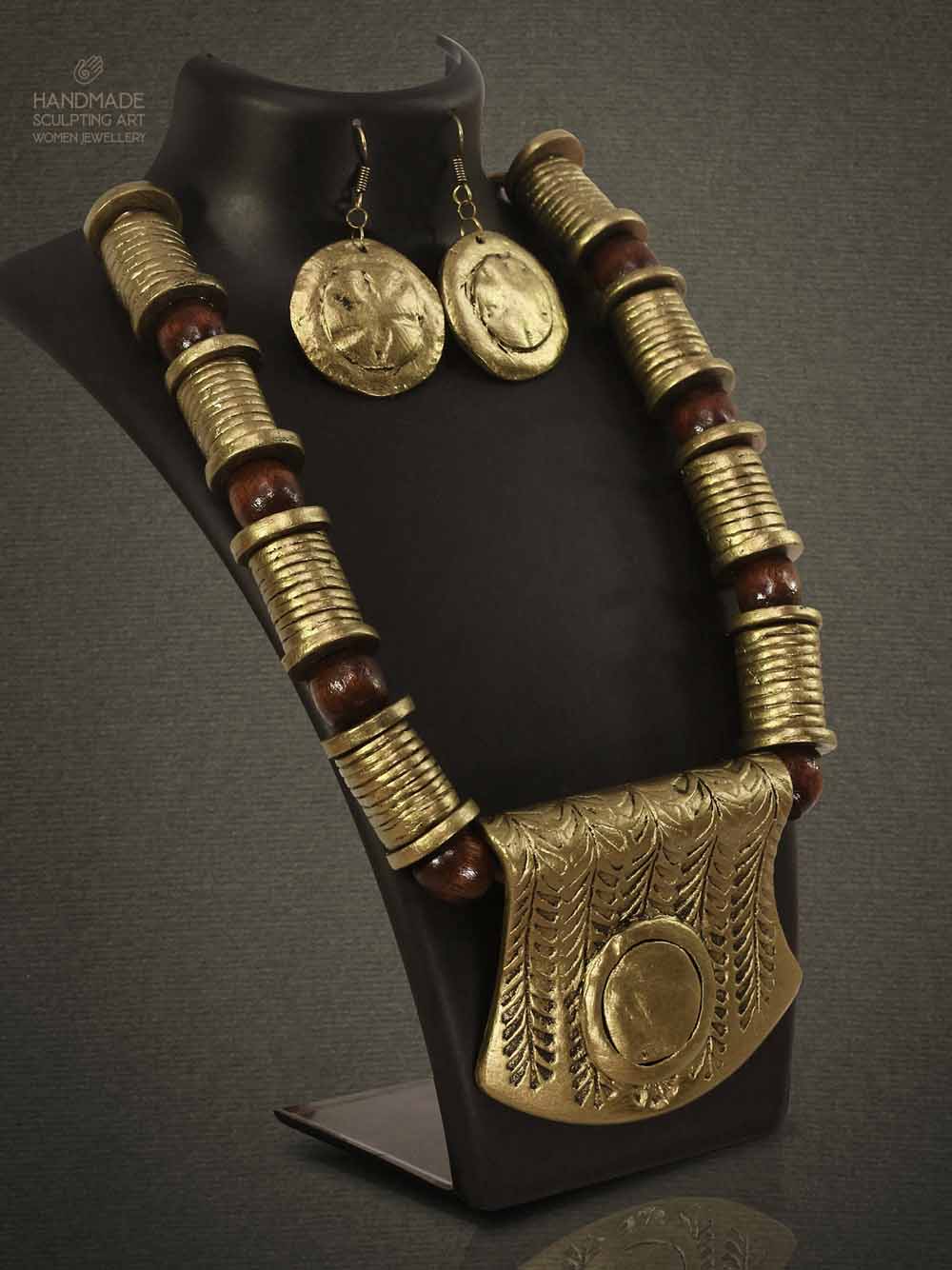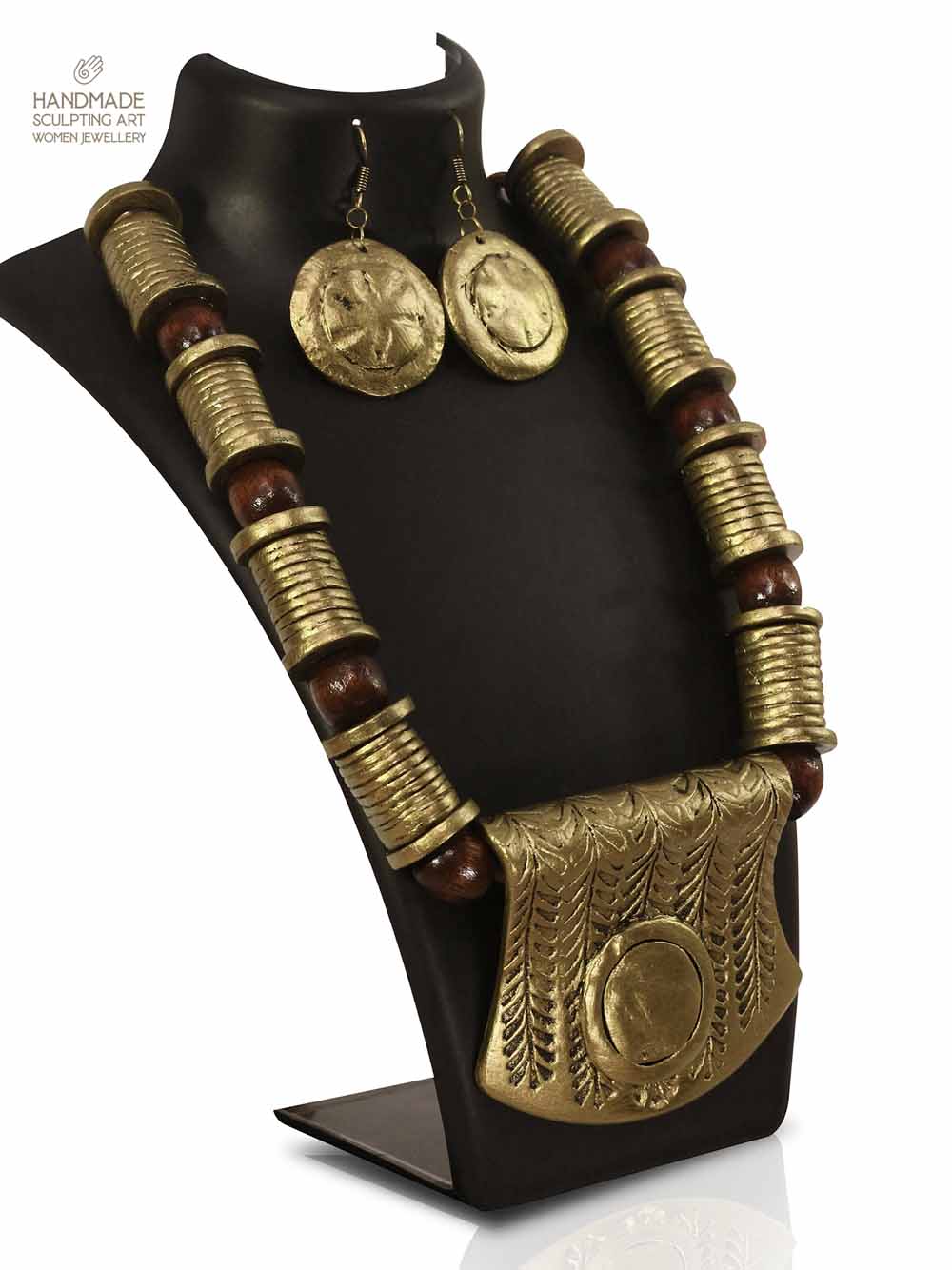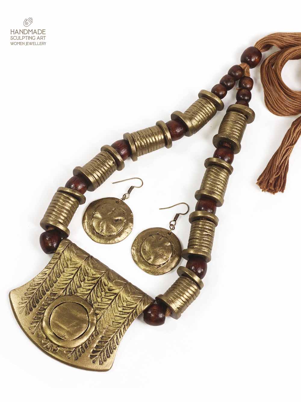materials: synthetic clay, anchor thread tassel, wooden beads # product colour: antique gold # tassel colour: dark brown # measurements: length approximate 10.5 inches (without tassel) # product weight: approximate 220 grams.