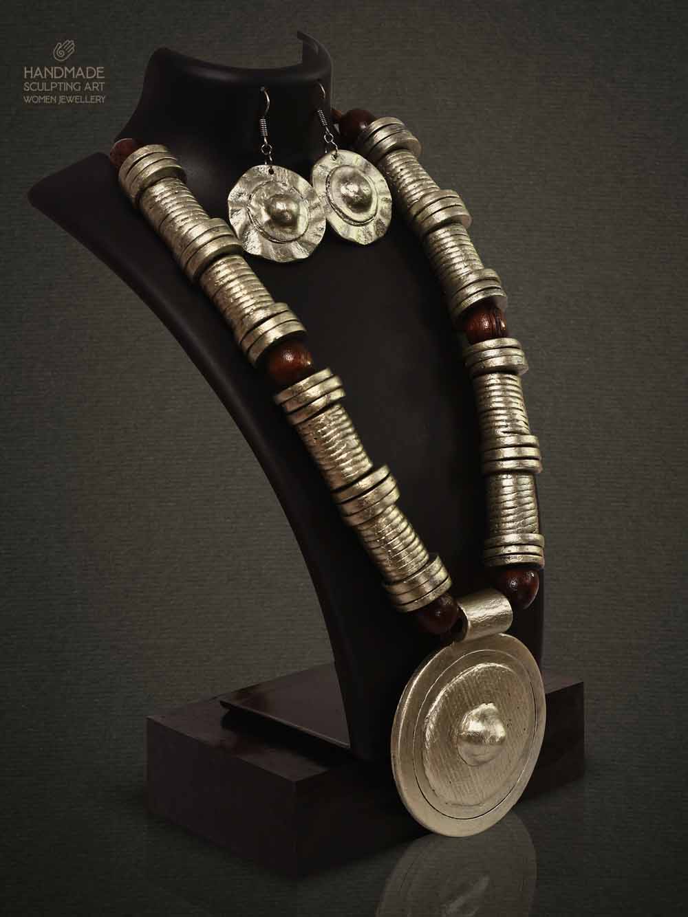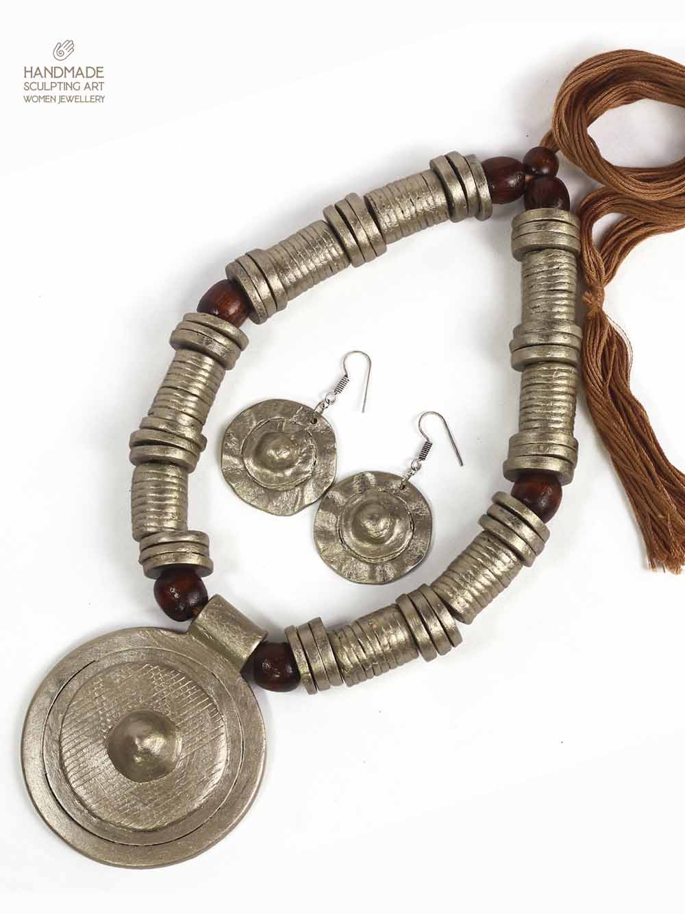 materials: synthetic clay, anchor thread tassel, wooden beads # product colour: silver # tassel colour: sandstone # measurements: length approximate 12 inches (without tassel) # product weight: approximate 250 grams.