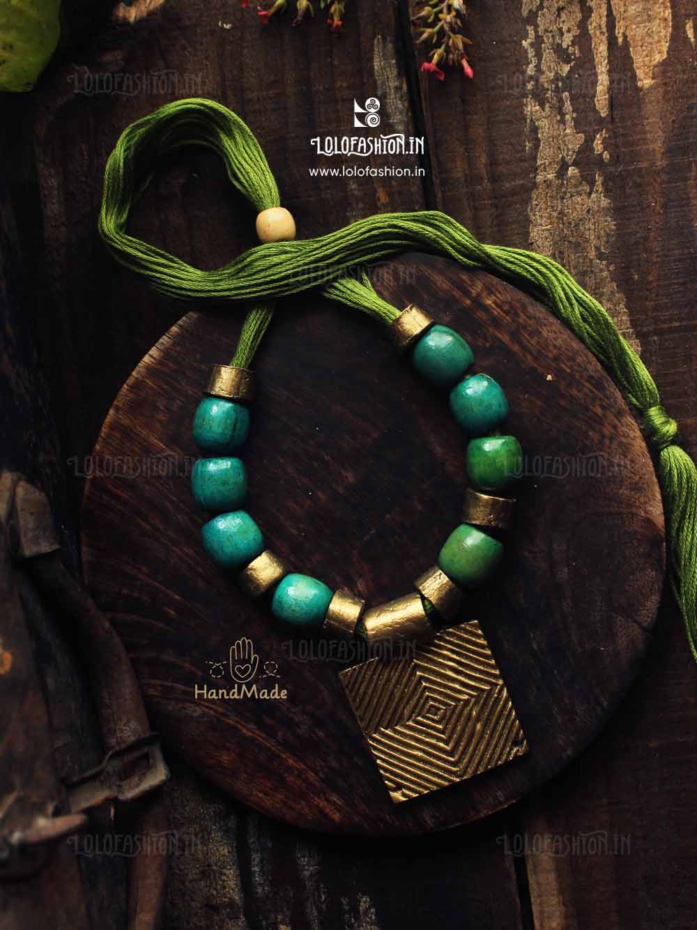 materials: synthetic clay, anchor thread tassel, wooden beads # product colour: antique gold # tassel colour: sap green # product weight: approximate 55 grams.