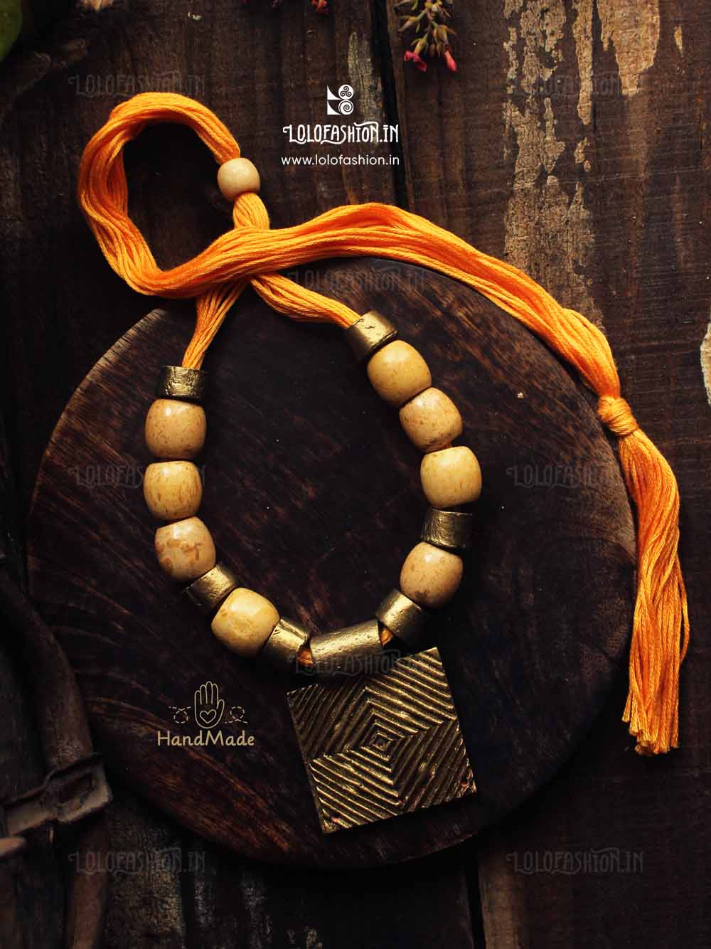 materials: synthetic clay, anchor thread tassel, wooden beads # product colour: antique gold # tassel colour: orange # product weight: approximate 55 grams.
