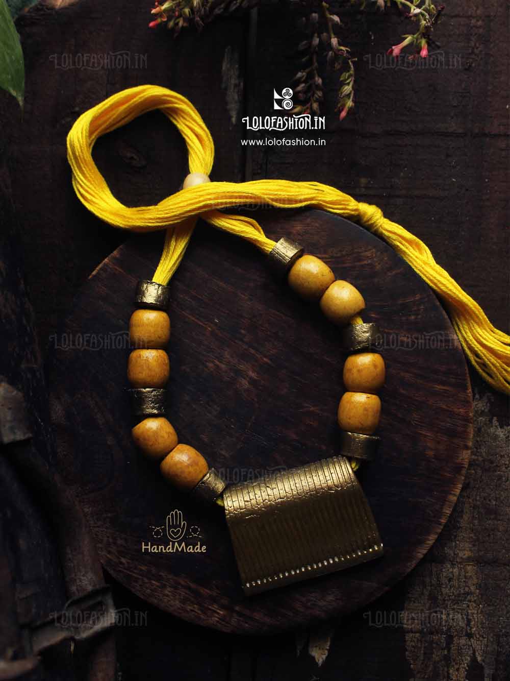 materials: synthetic clay, anchor thread tassel, wooden beads # product colour: antique gold # tassel colour: chrome yellow # product weight: approximate 60 grams.
