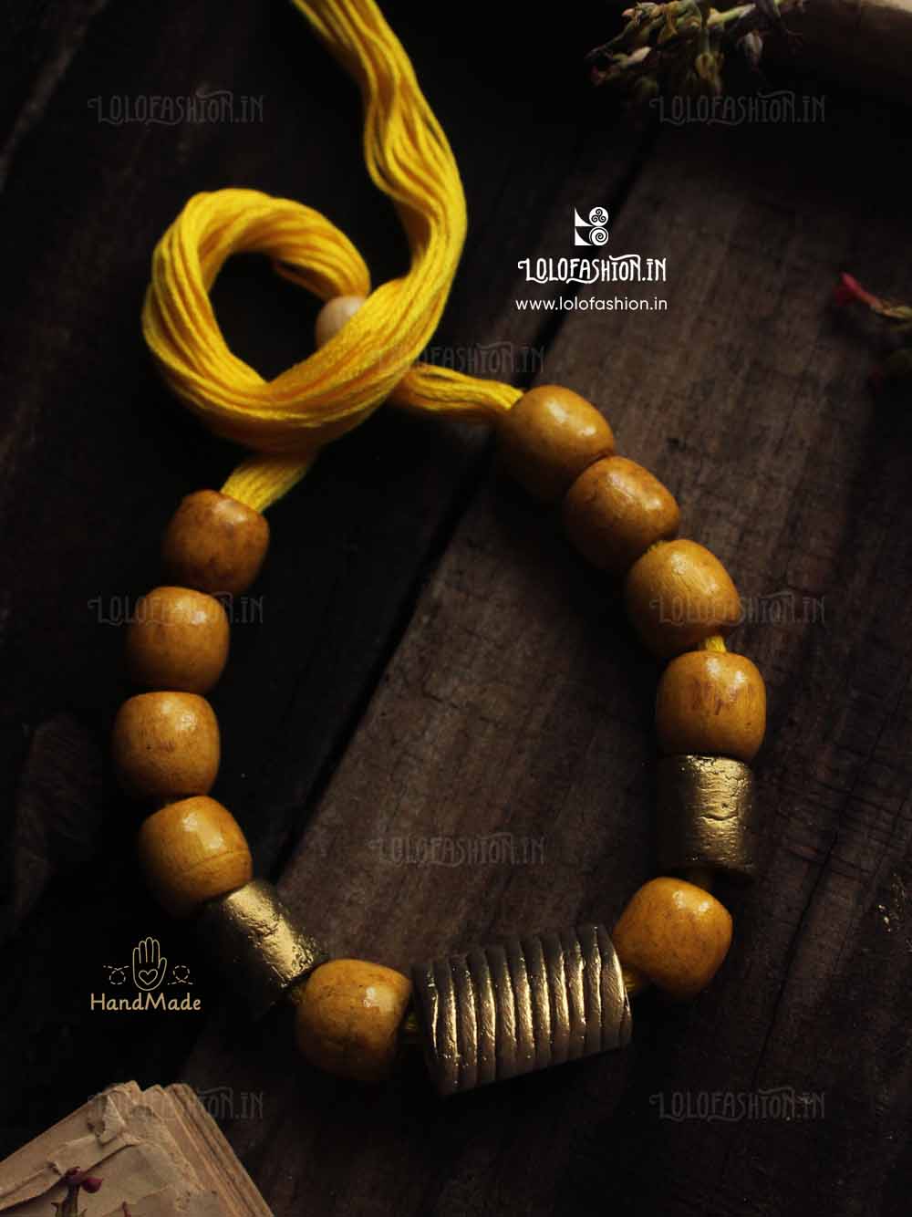 materials: synthetic clay, anchor thread tassel, wooden beads # product colour: antique gold # tassel colour: chrome yellow # product weight: approximate 45 grams.
